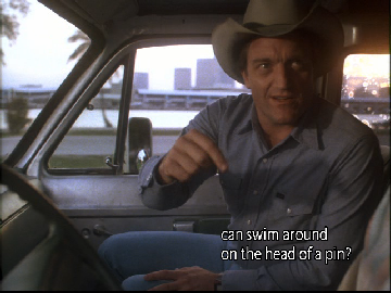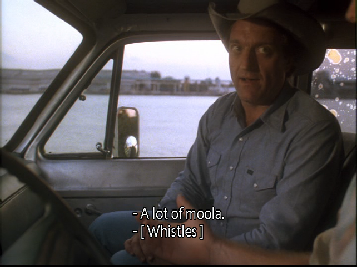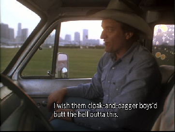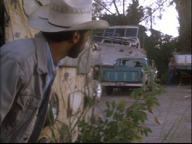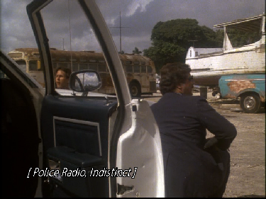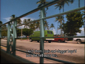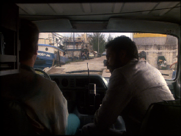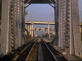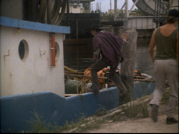 Then we go to the buy. This was filmed on location at Central Super Mix, on the south side of the Miami River just west of the famous rail road bridge that Sonny leapt off of to apprehend Tubbs in the Pilot of Miami Vice. We have since seen it in Killshot, and Rites of Passages as they pull the dead hooker out of the river at this same location. As Izzy checks out the Moby Jim we see the railroad bridge in the background.