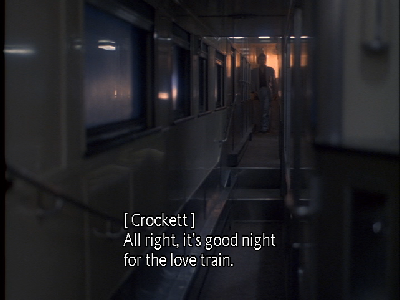 Crockett and Tubbs enter from one end of the train but Tubbs quickly reroutes to catch a fleeing female and patron. This is not inside the Silver Stag but they are inside the Silver Crescent.