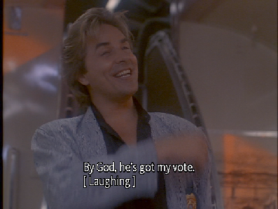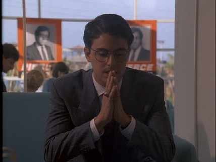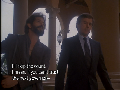 The episode starts with Tubbs and Crockett inside the OCB listening to a campaign commercial. This was filmed on set inside Stage A at Greenwich Studios.