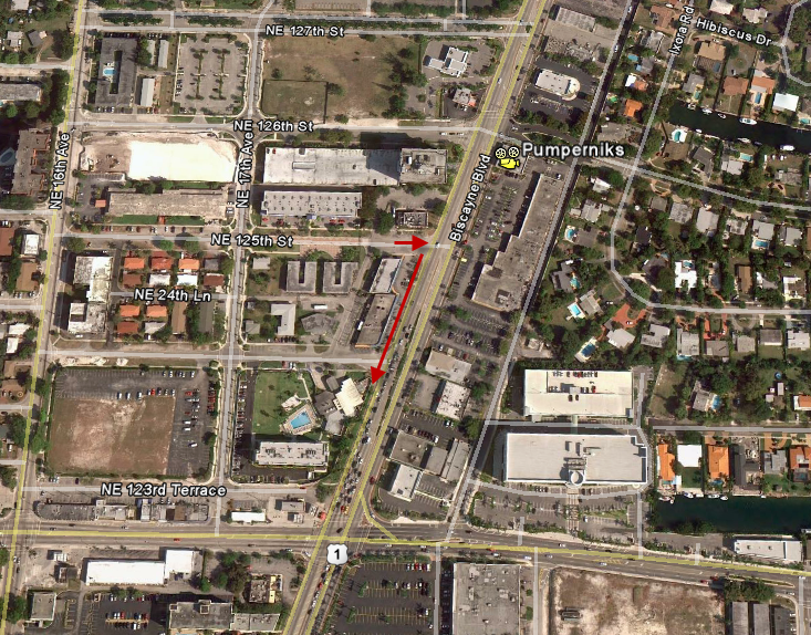 Then we see the Cadillac turn from NE 125th Street and head southbound on Biscayne Blvd. thru the 12400 blk., passing the camera (just north of NE124th St.) as it pans south. This is reused footage from French Twist as Tubbs was rushing to rescue Cindy.