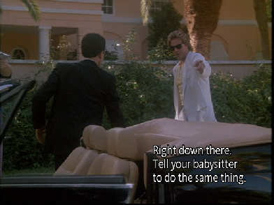 Intercut we see DEA Agent Brody, calling from the conference room. Reportedly filmed at 455 Ocean Drive, Miami Beach.