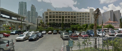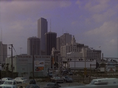 Then we see another instance where they flipped or reversed an image. The establishing shot is reversed. The backward signs are a dead give away. This final scene of the episode was filmed on location on NE 7th Street just west of NE 2nd Avenue in downtown Miami.