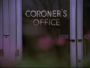Then we see an establishing shot of the entrance to the Coroner’s Office. This looks like stock footage and likely in Los Angeles. Then we go inside. This has every appearance of being a set at the studio and I would be very surprised if it were filmed on location. Location unconfirmed.