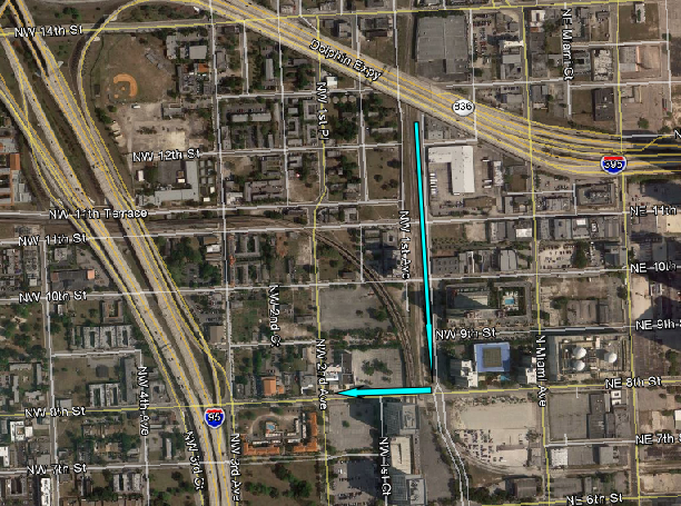 Then we see them continue west on NW 8th Street and pass under the metro rail.