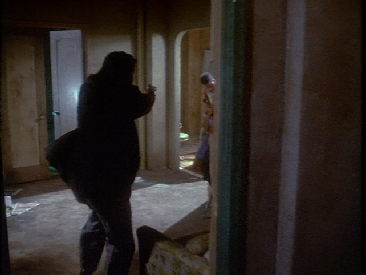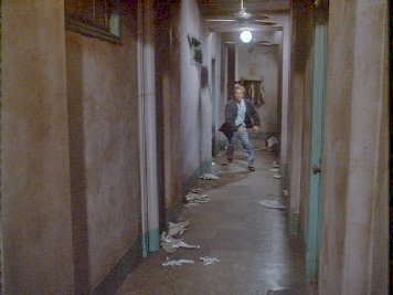 Then Crockett runs out into a hallway. The hopper windows make this appear to have been filmed in a basement though it is suppose to have been filmed on at least the second floor. Filming location unknown.