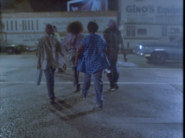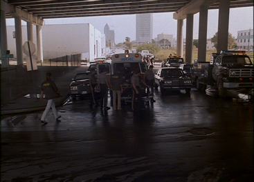 Then we see them turn from southbound on NW 1st Avenue onto NW 8th Street headed west. The Miami Arena is seen under construction in the background. The warehouses we saw in episode 11, Little Prince were torn down for the arena’s construction. It has since been torn down to make room for a vacant lot.