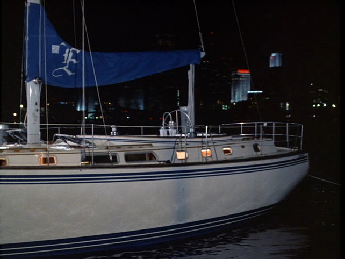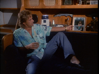 Then we see Crockett aboard the St. Vitus Dance. Docked at Watson Island with downtown Miami in the background.